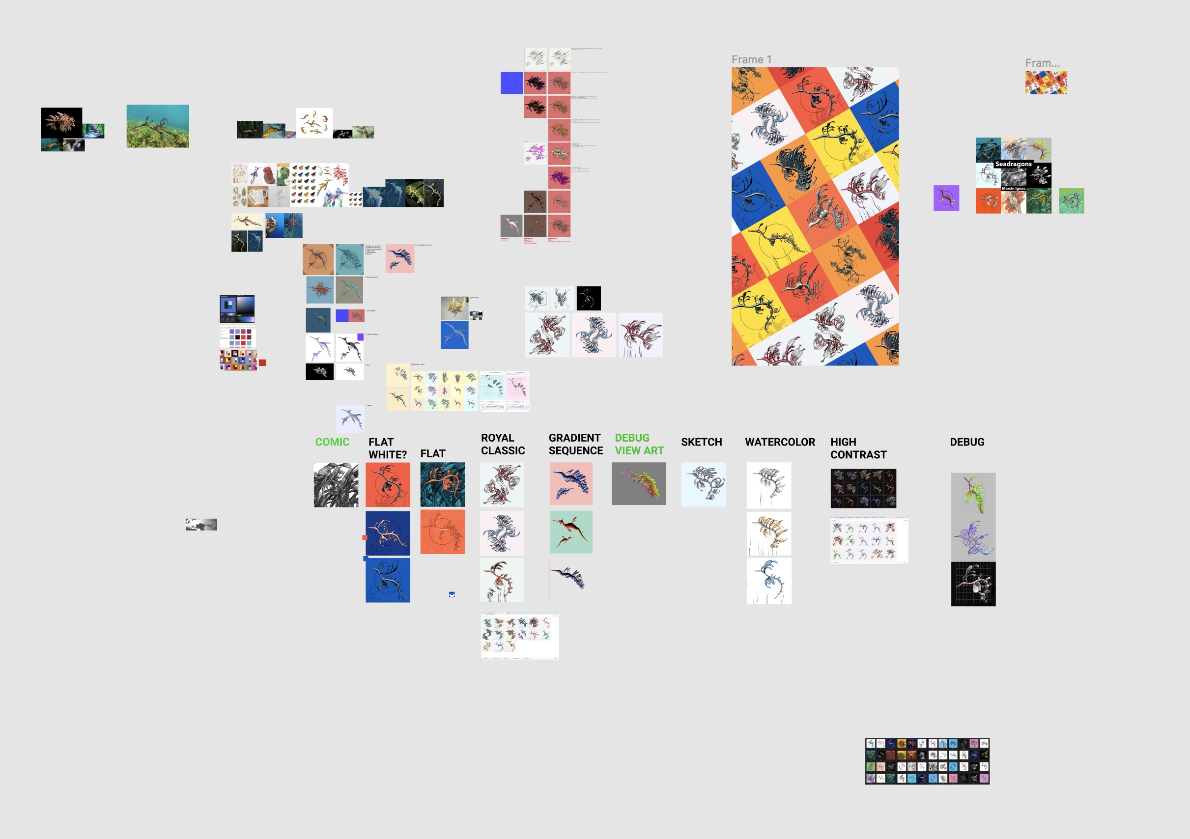 What followed was weeks of experiments with textures, shader materials, rendering styles, layout automation (so for example each seadragon is alwasy fully visible, no matter it's shape or rotation) and optimisations for mobile and weaker GPUs.